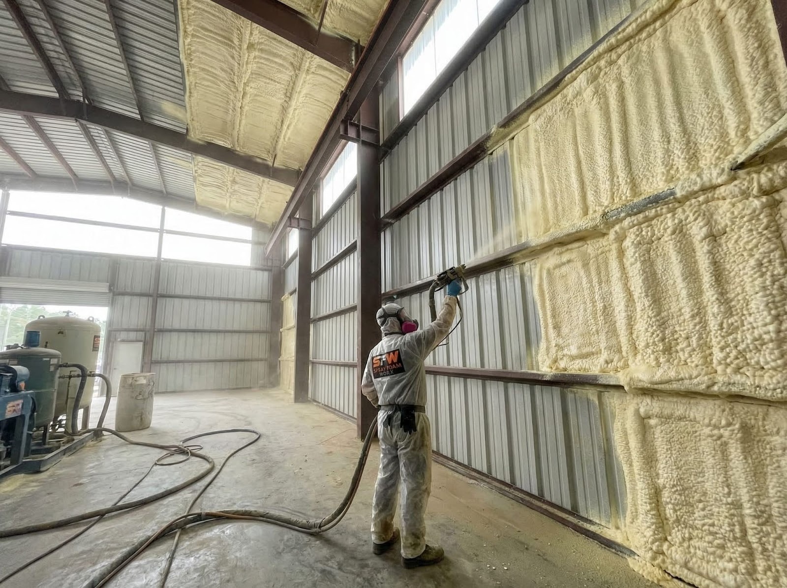 Closed-cell spray foam is the gold standard for metal buildings. Unlike fiberglass, it creates a seamless air and vapor barrier that sticks directly to the steel, preventing the moisture issues common in the South.